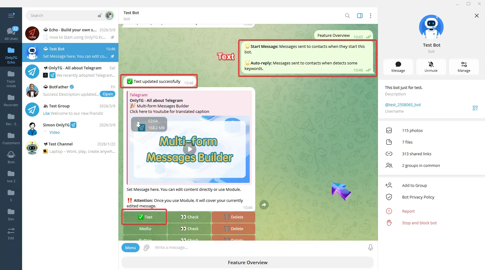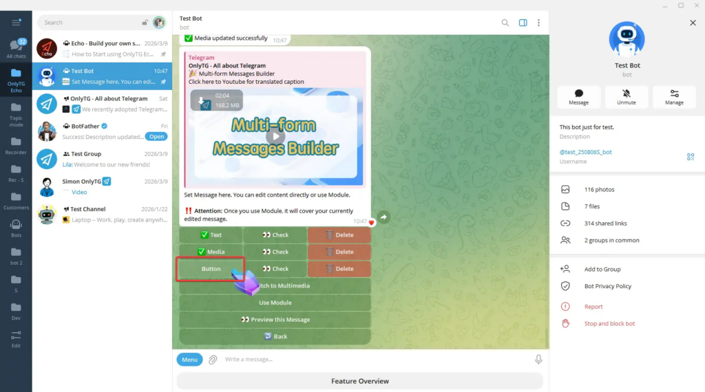 Please note that if you upload a Round Video or a Sticker, the text and button parts of this message will not be displayed.