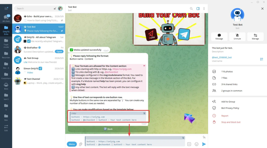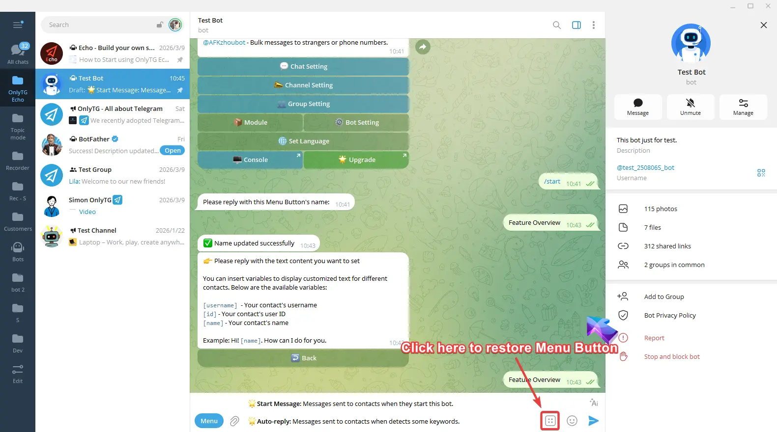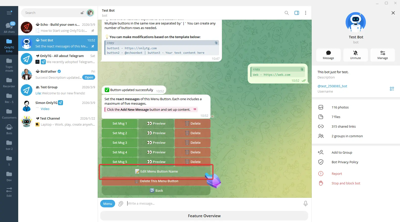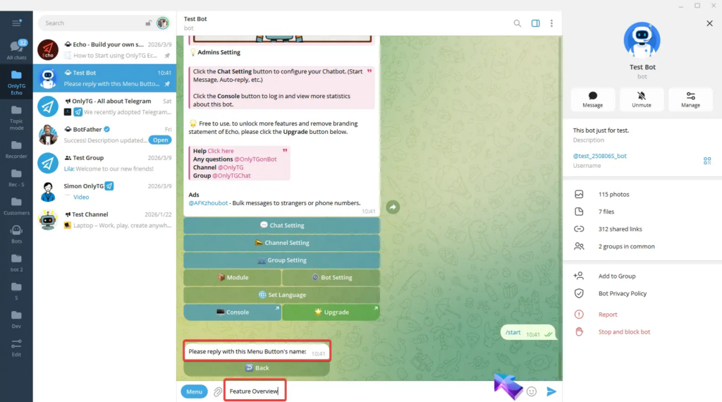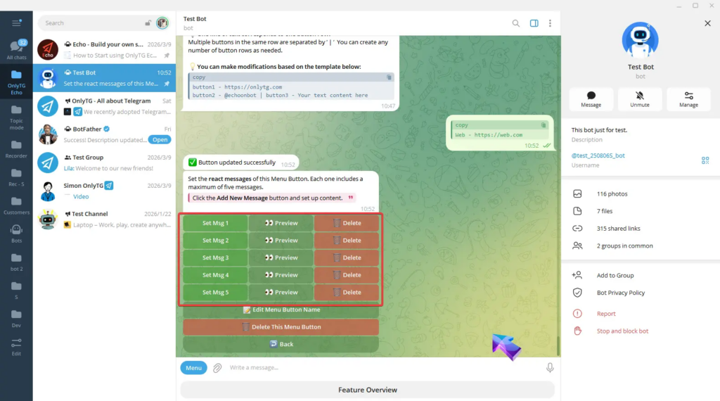 OnlyTG Echo provides the function to set Bot Menu Button below the bot input field.