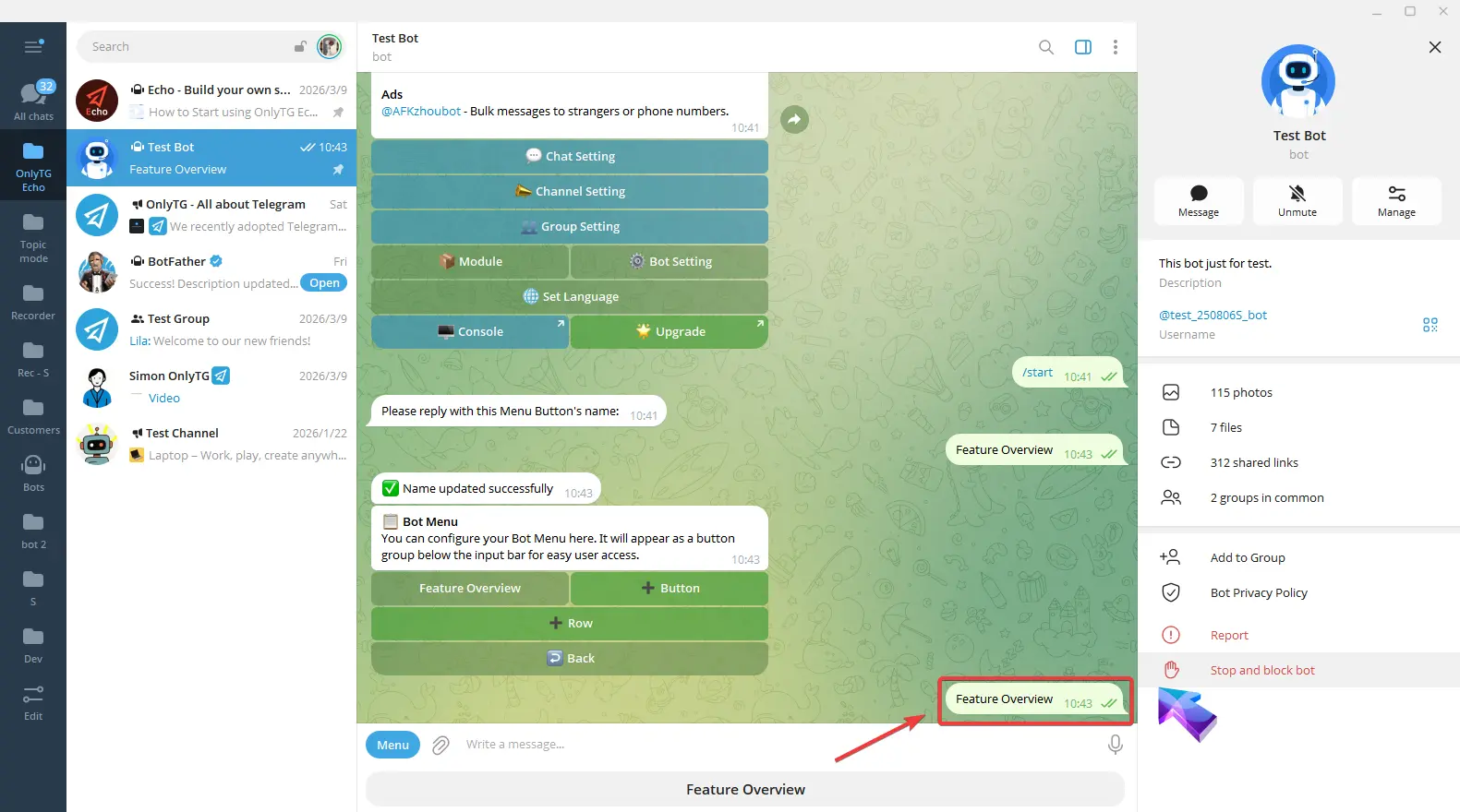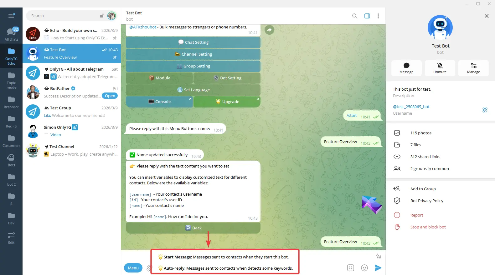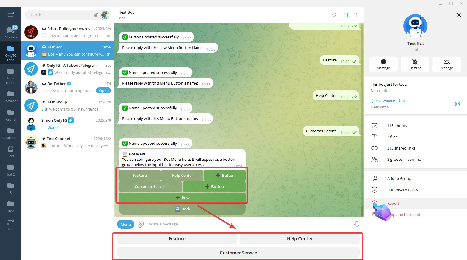 OnlyTG Echo provides the function to set Bot Menu Button below the bot input field.