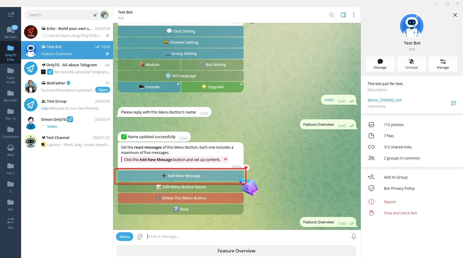 Click the button you have added in the Bot Menu section, then click Add New Message.