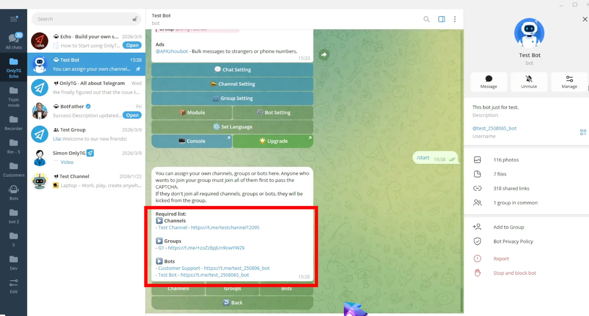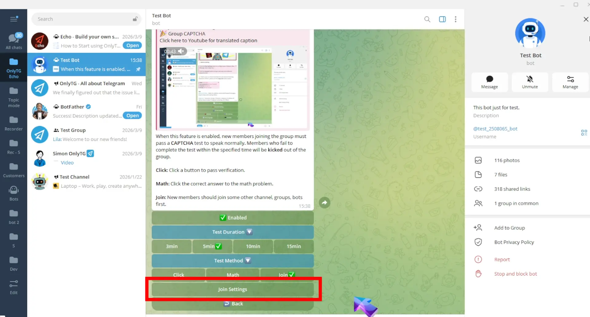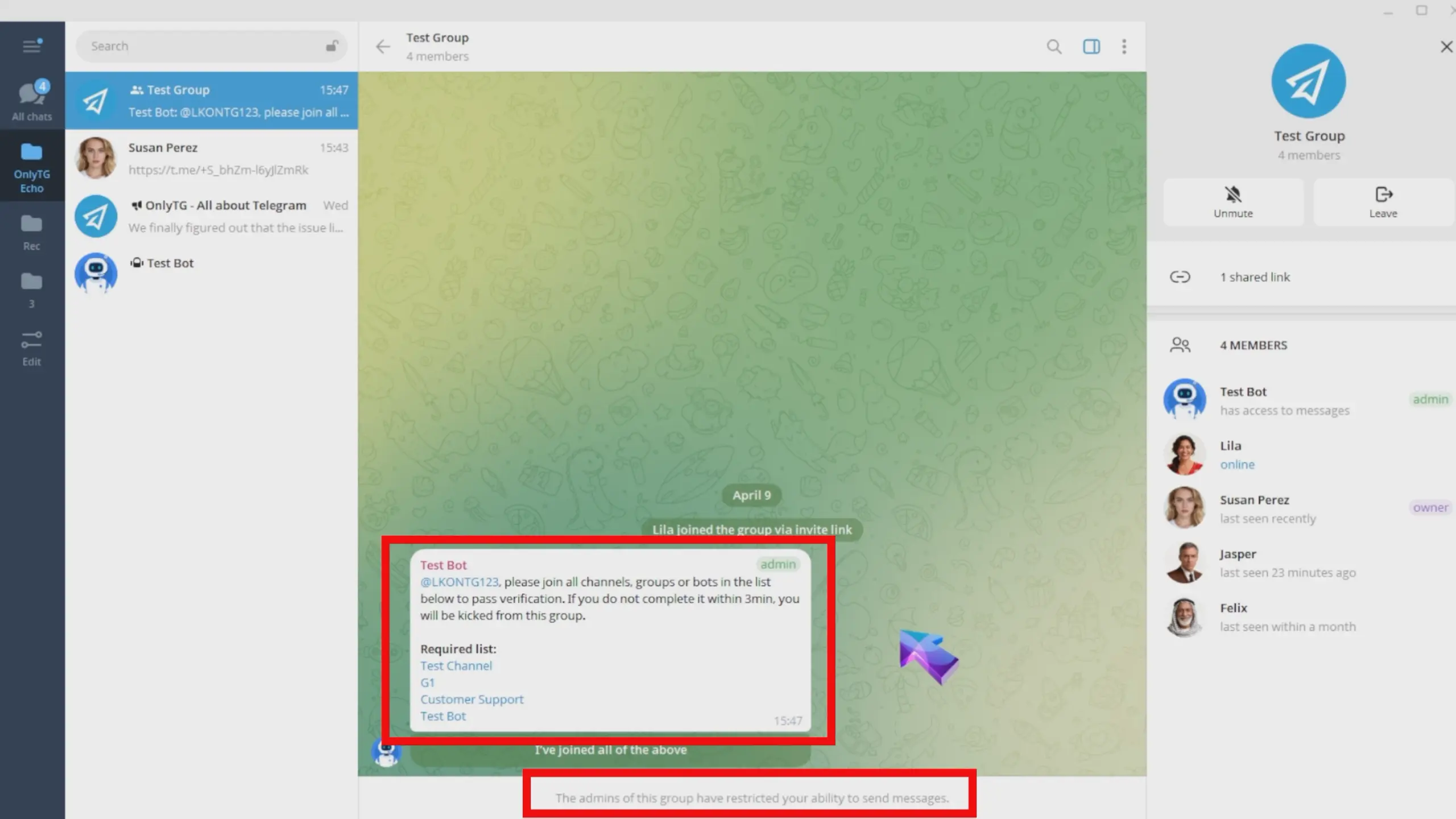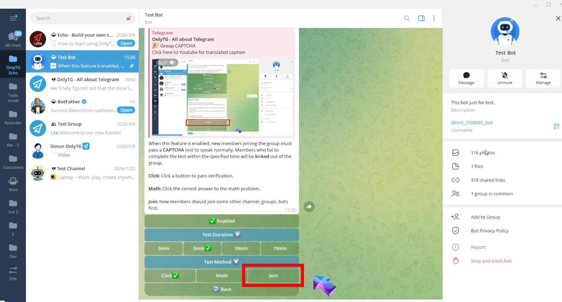 OnlyTG Echo has added a new Join Test Method to the CAPTCHA. New members will be muted upon joining the group. They must join the specified channels, groups or bots. Otherwise, they will be kicked out of the group after the test period.