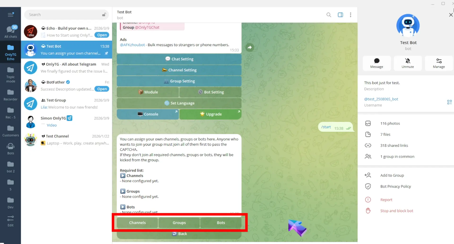 OnlyTG Echo provides the function to send the CAPTCHA test to new members joining the group. Firstly, you need to create a new bot…