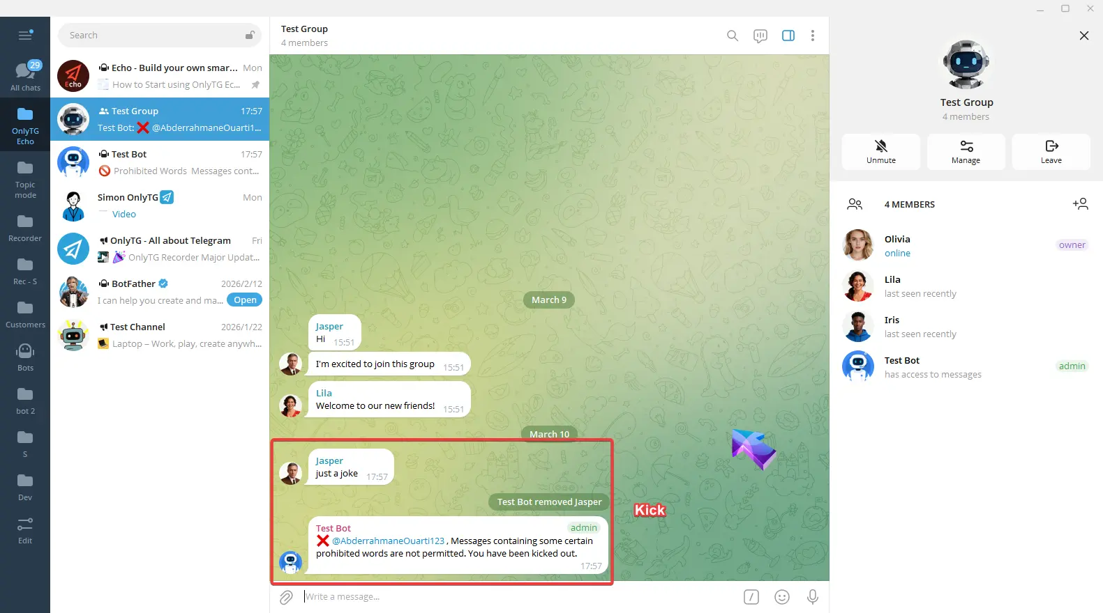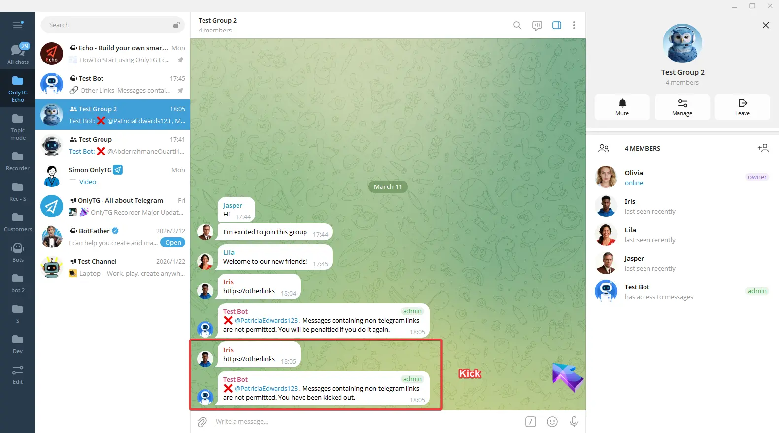 b. Kick: Kick members who violate the rules from the group. Supports the Penalty on 2nd Offense option.