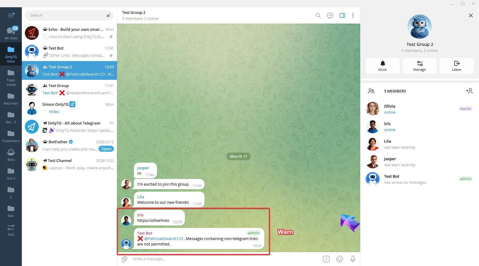 This rule will be triggered when members sends a message in the group containing non-telegram links.