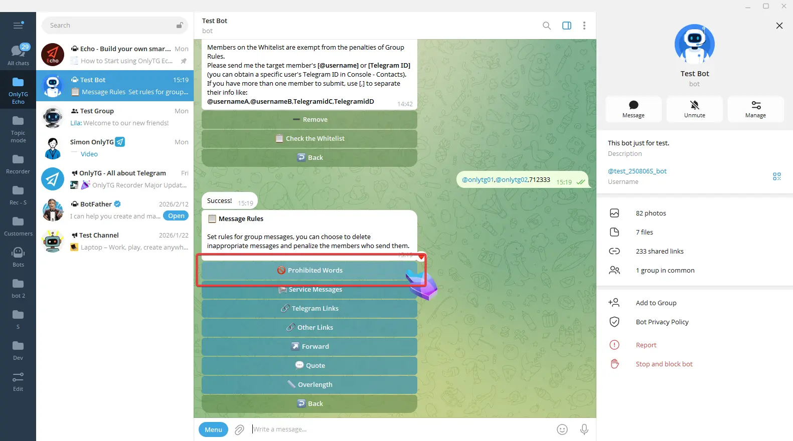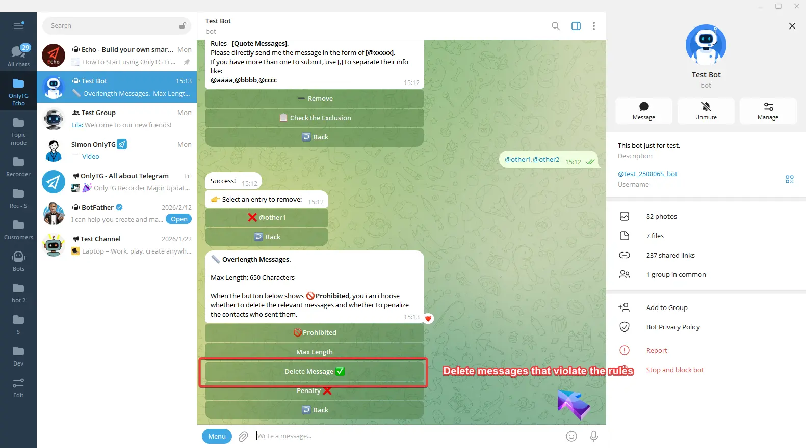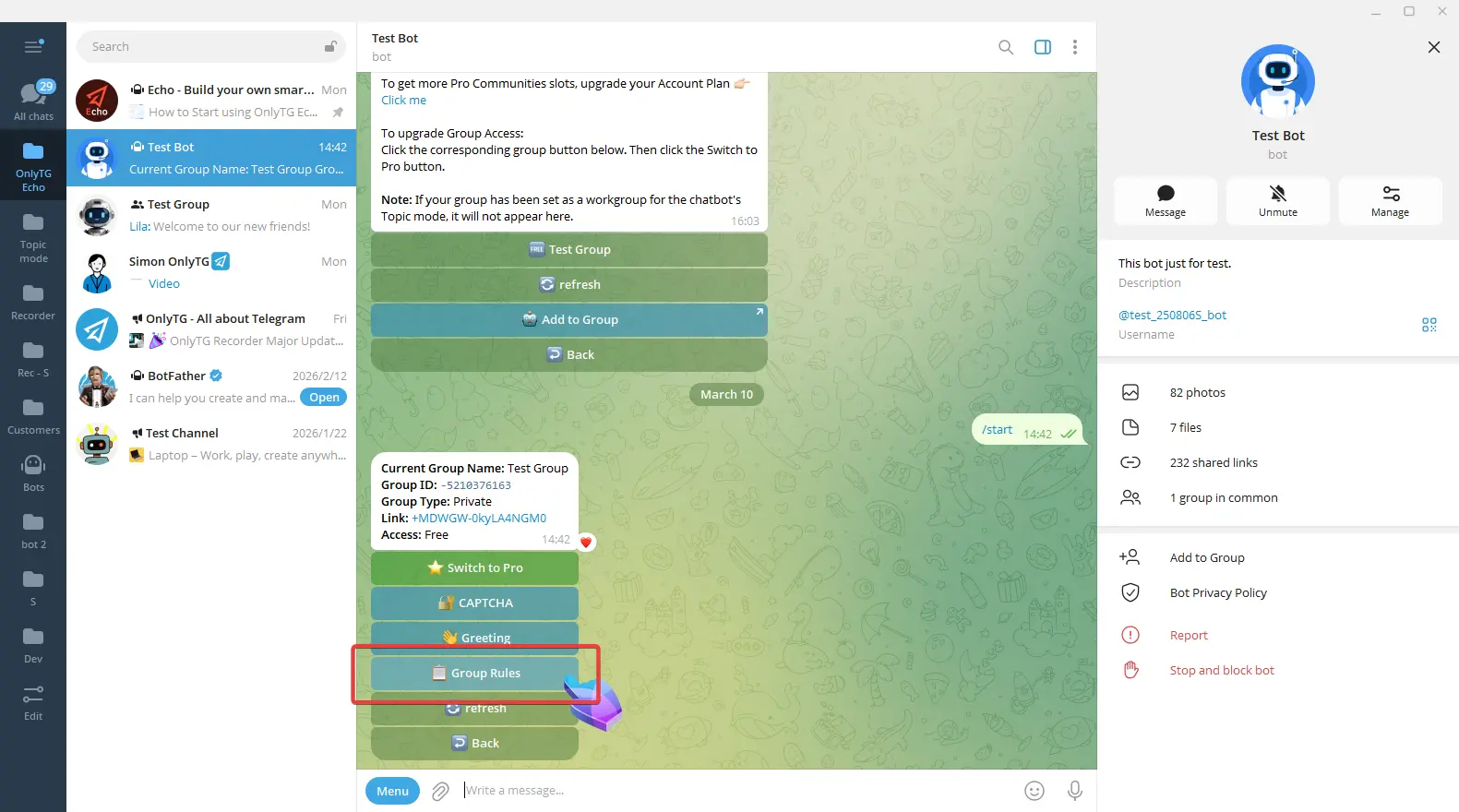 OnlyTG Echo provides the function to set rules for group via your bot.