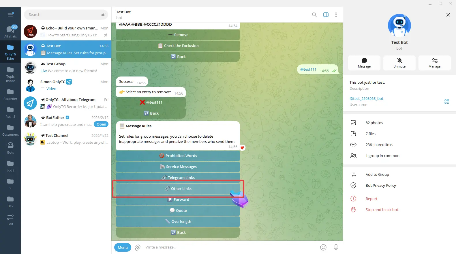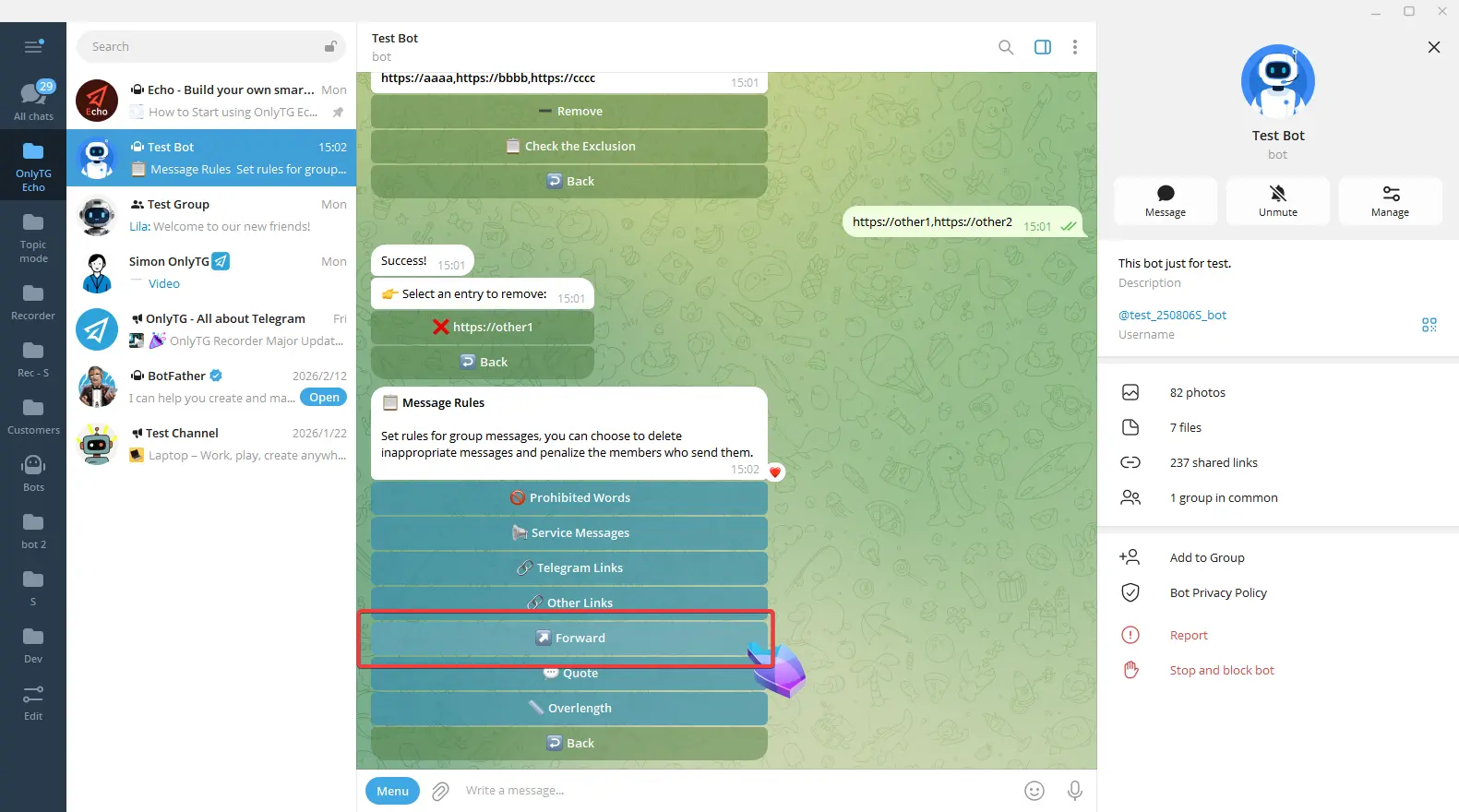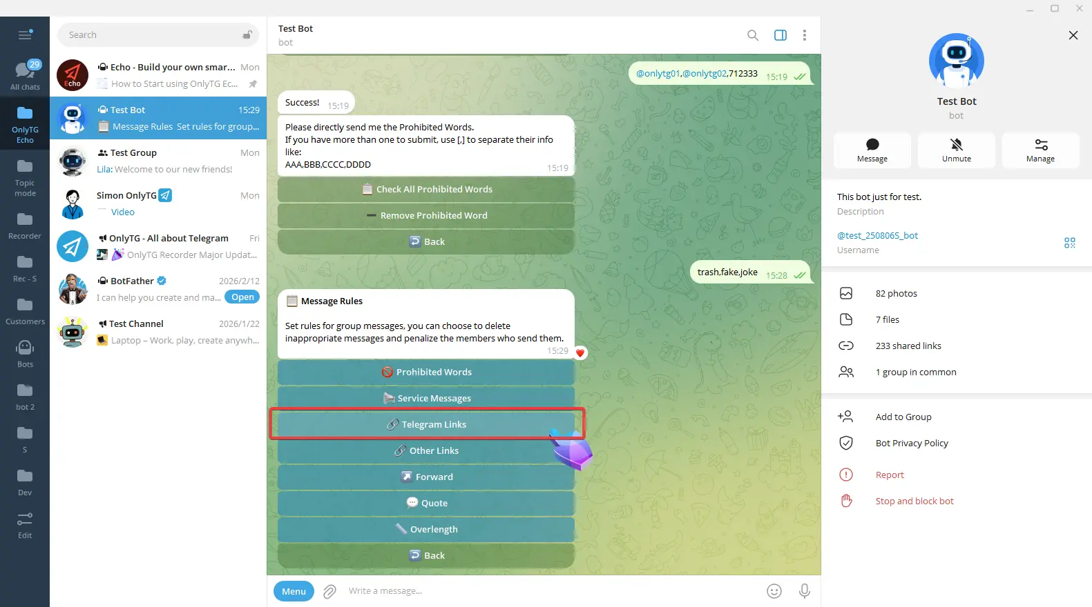 OnlyTG Echo provides the function to set rules for group via your bot.