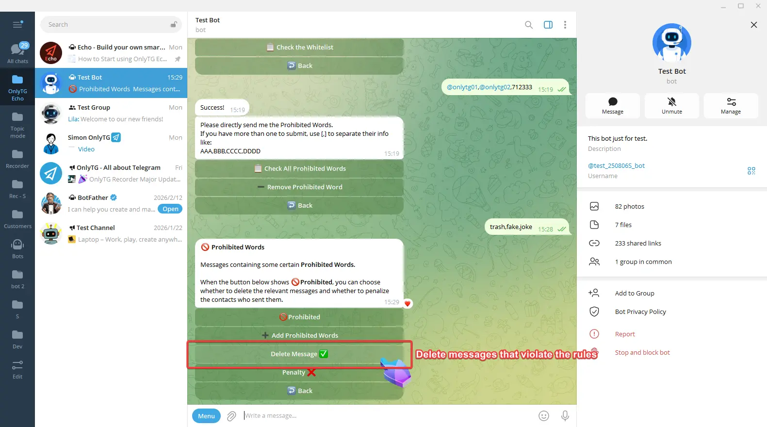 Delete Message: Automatically delete messages that violate the rules. Click to turn this function on or off.