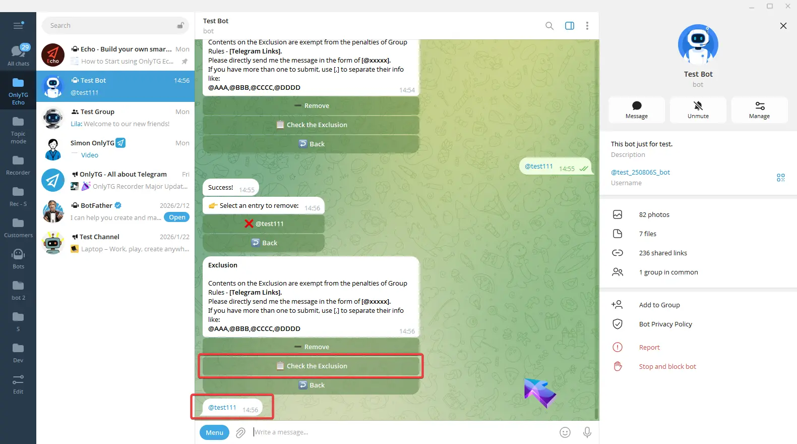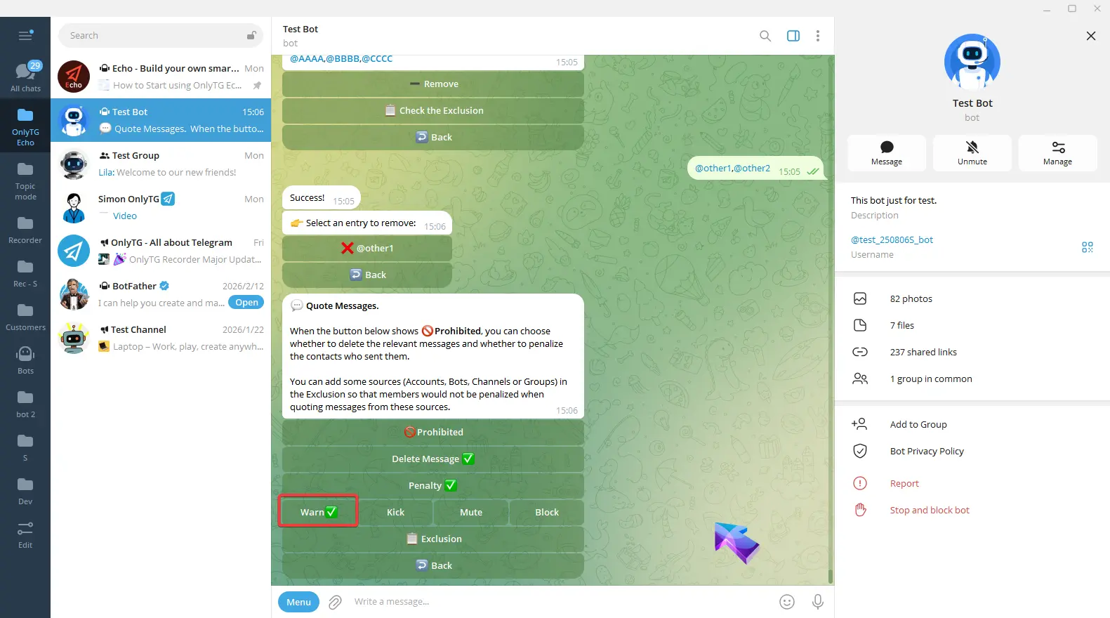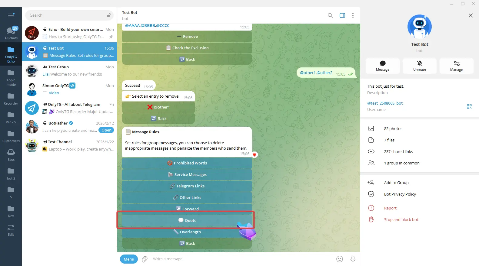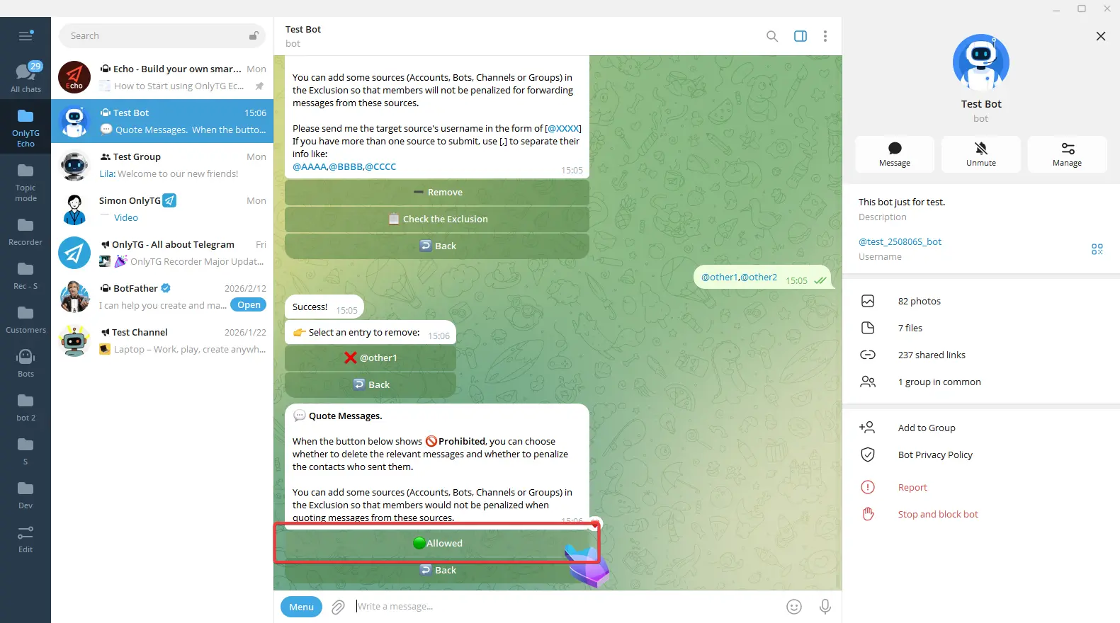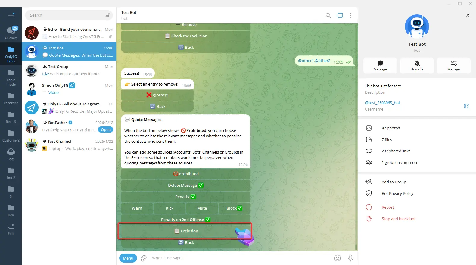 Exclusion: You can add excluded sources, including Accounts, Bots, Channels or Groups. Members will not be restricted by this rule when quote messages from excluded sources.