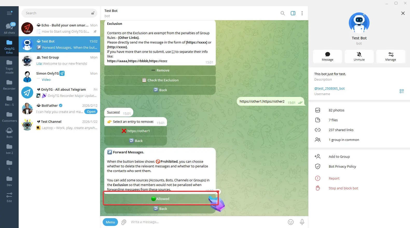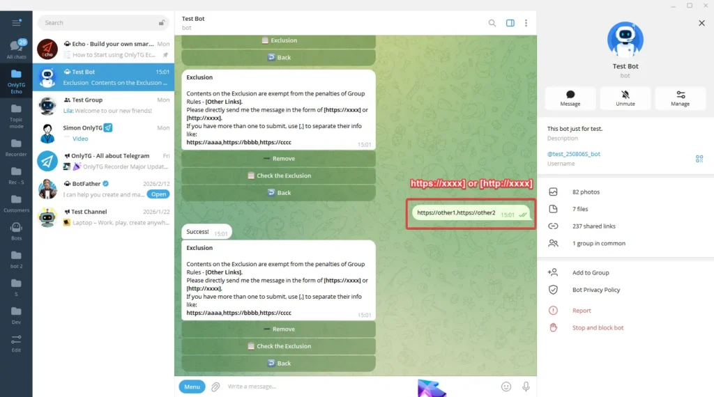 Exclusion: You can add excluded sources, including Accounts, Bots, Channels or Groups. Members will not be restricted by this rule when forwarding messages from excluded sources.