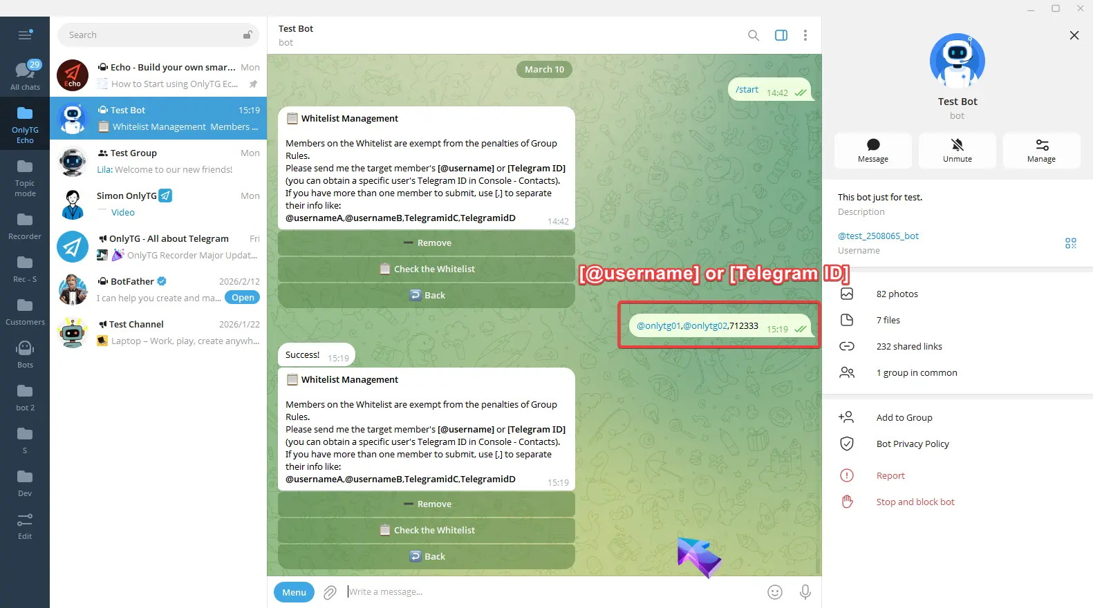 Simply send the target member’s [@​username] or [Telegram ID] to add them successfully.