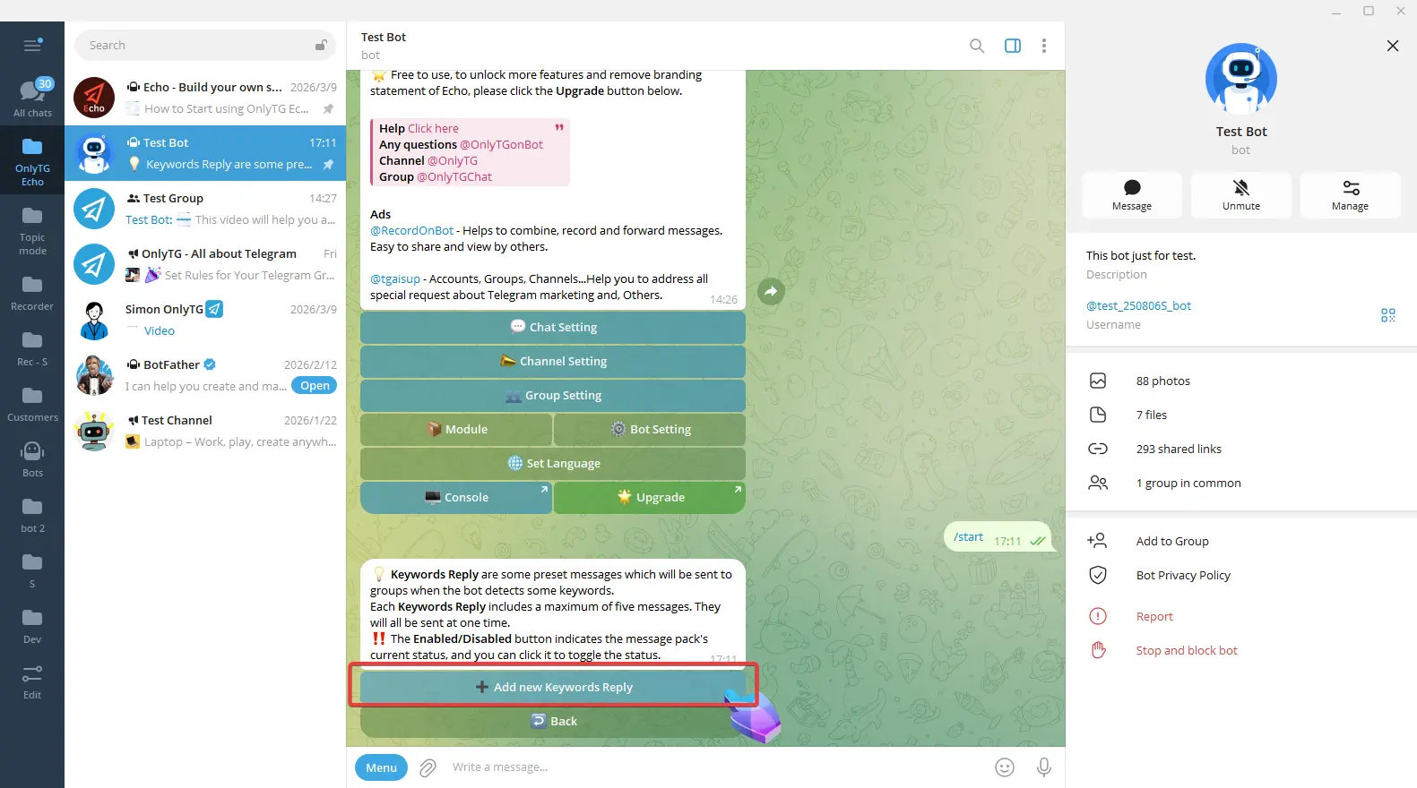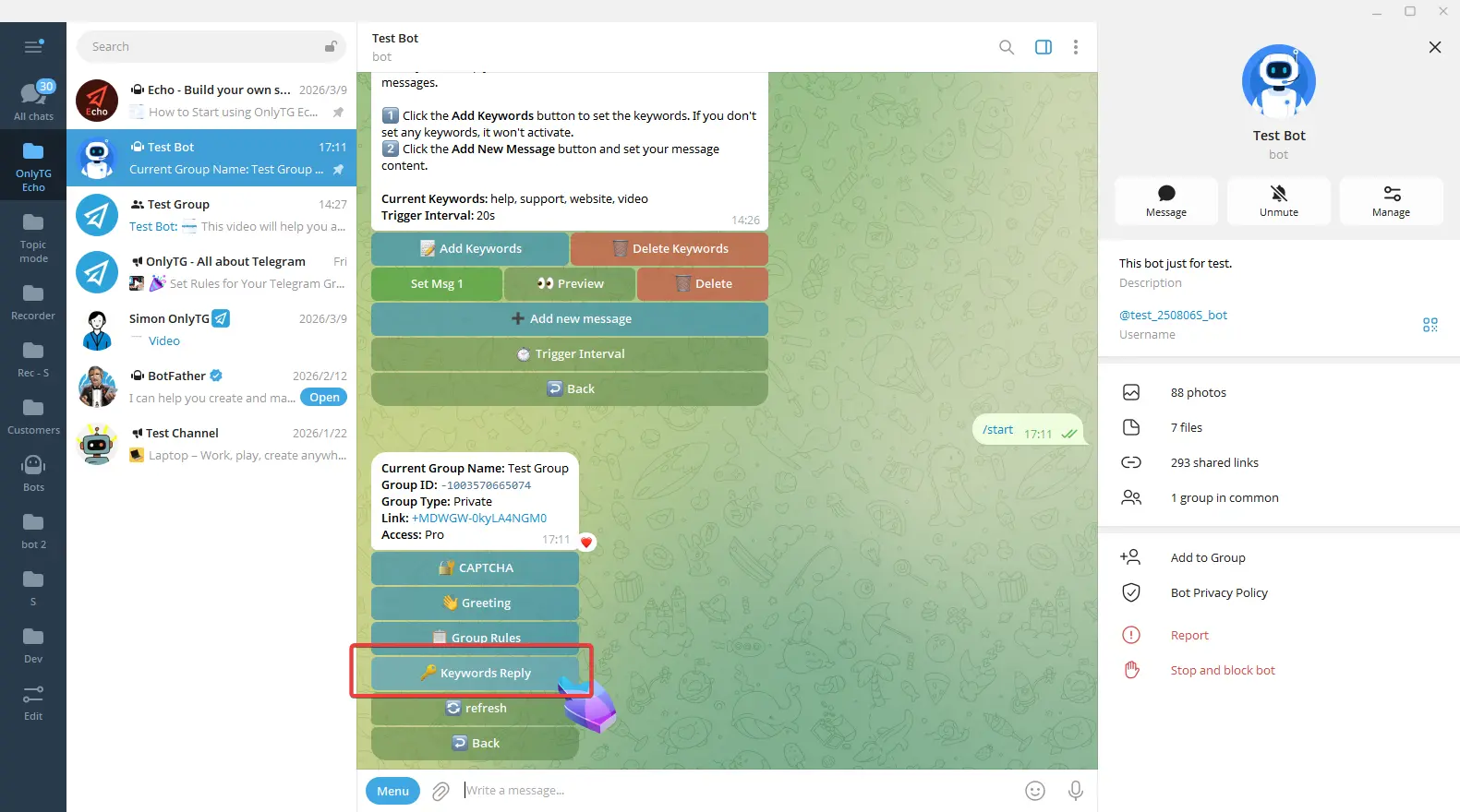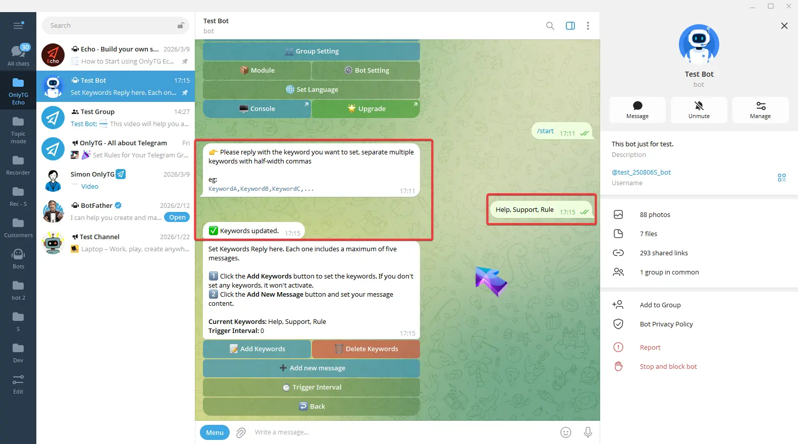 OnlyTG Echo provides the function to set keywords reply for your group. Simply set keywords and messages in advance, and the bot will reply automatically in your group.