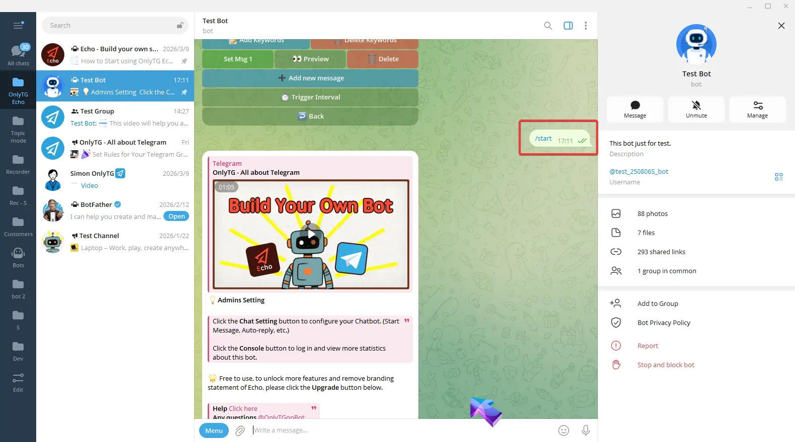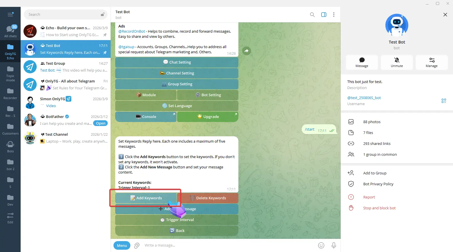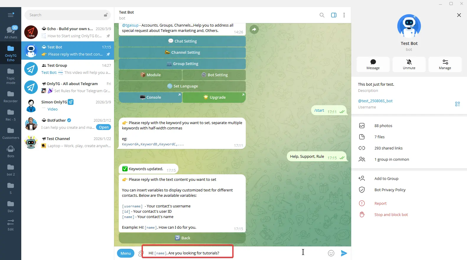 OnlyTG Echo provides the function to set keywords reply for your group. Simply set keywords and messages in advance, and the bot will reply automatically in your group.