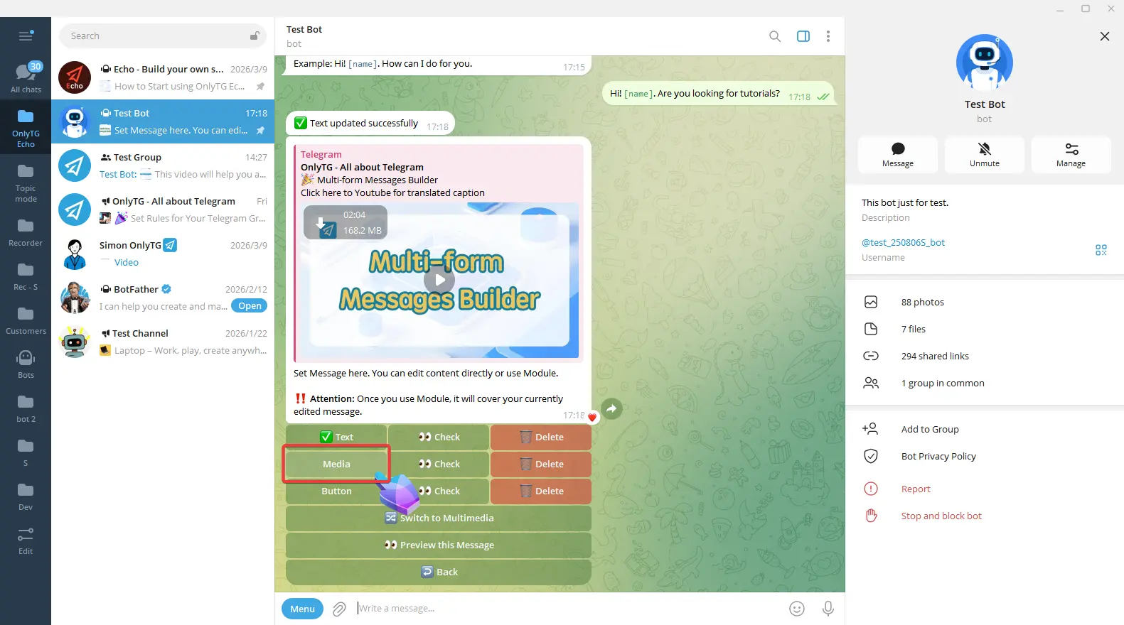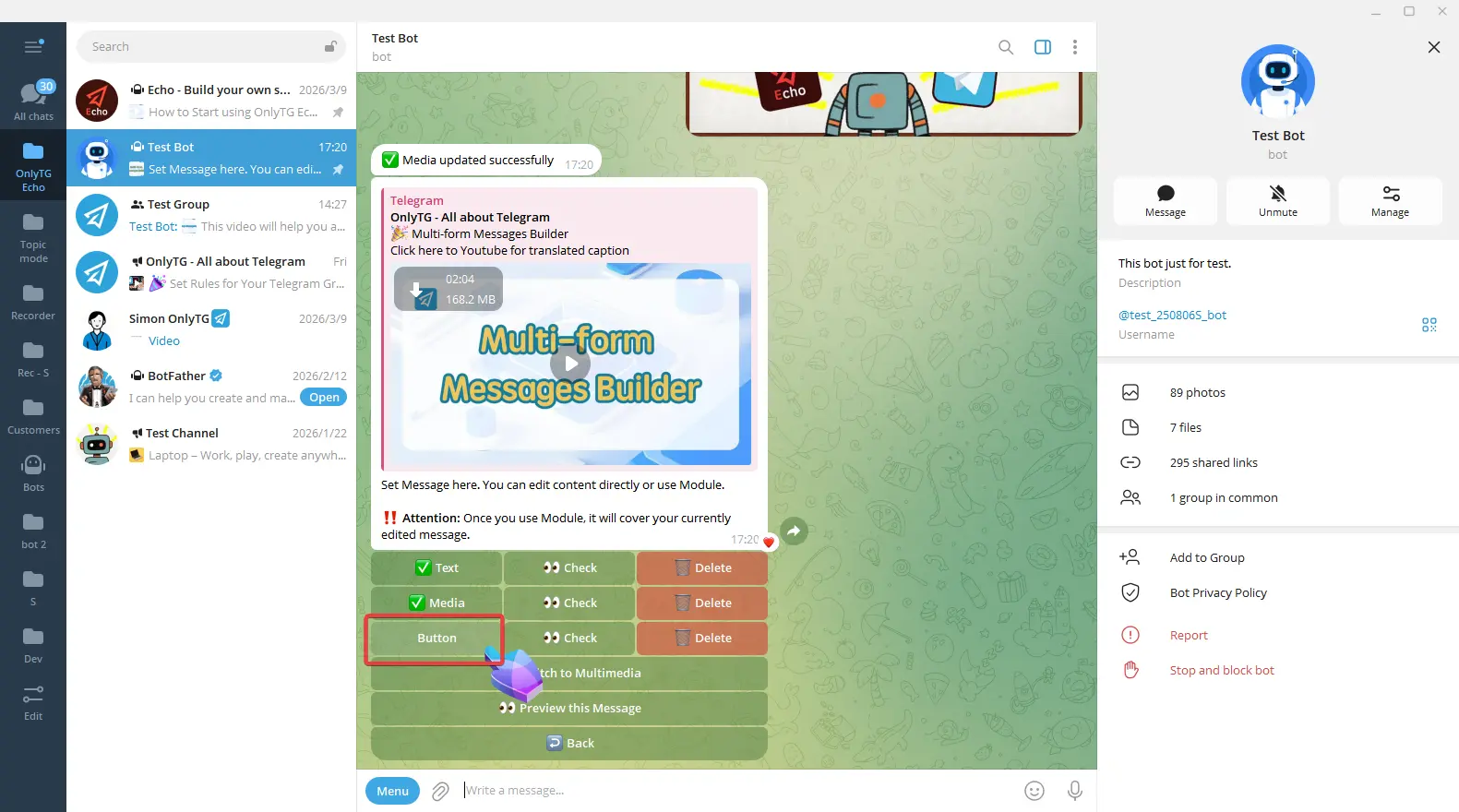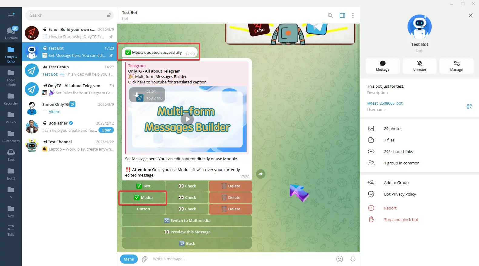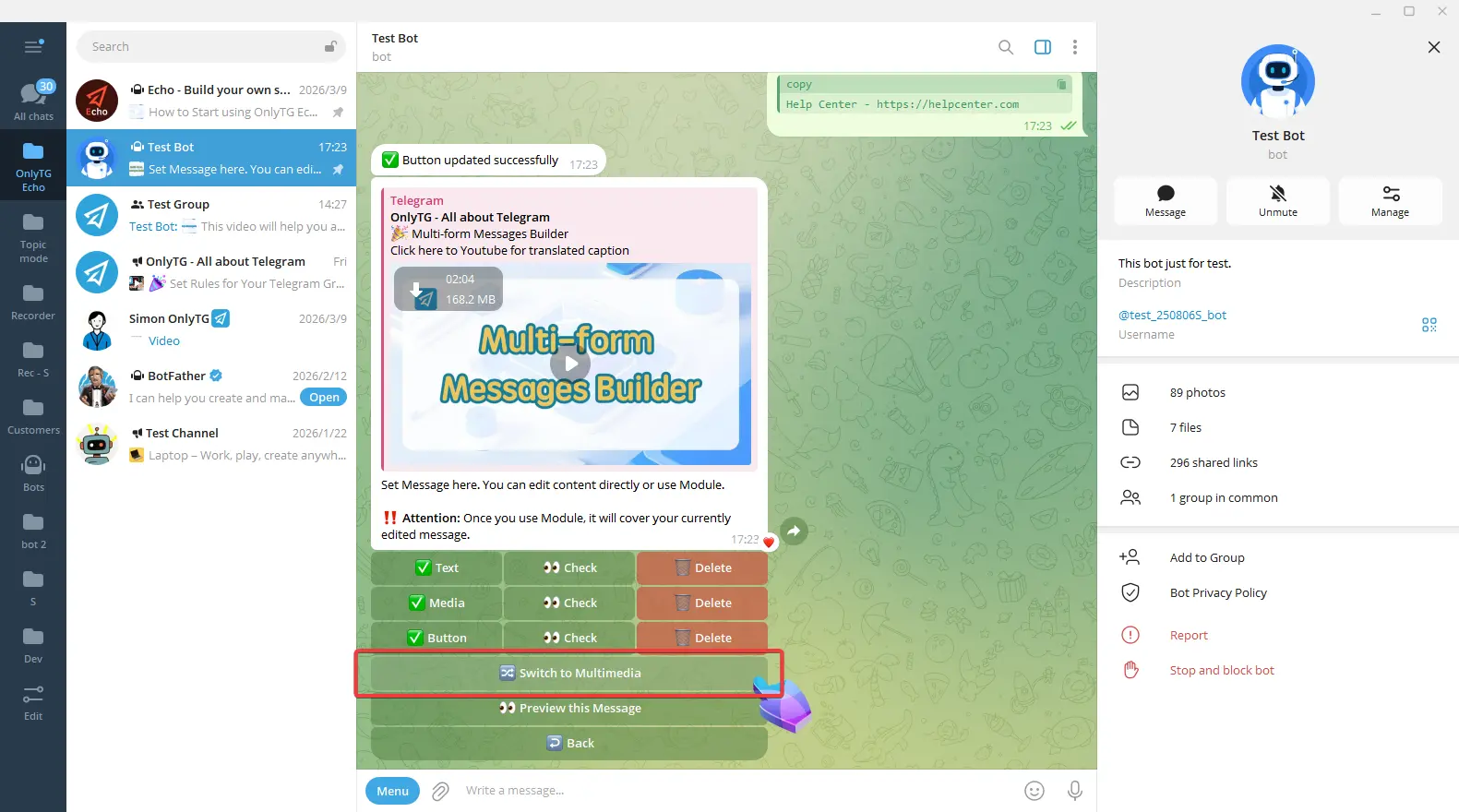 Switch to Multimedia: Convert the post to a mode which you can configure text and multiple images/videos, but files and buttons are not supported. We won’t use this mode for now. (Click here to learn how to set multimedia messages)
