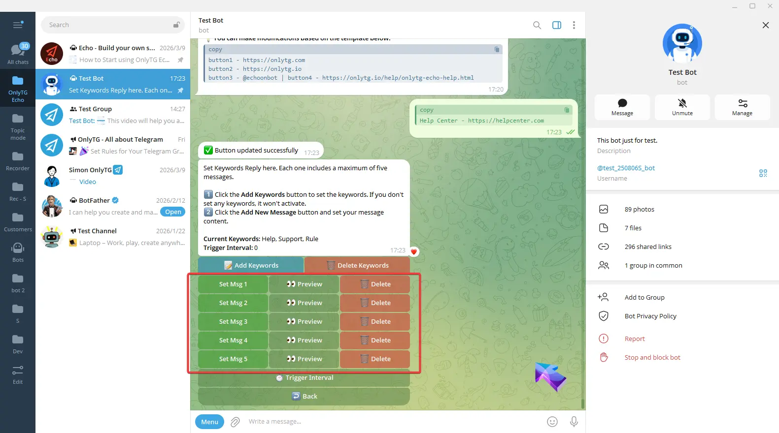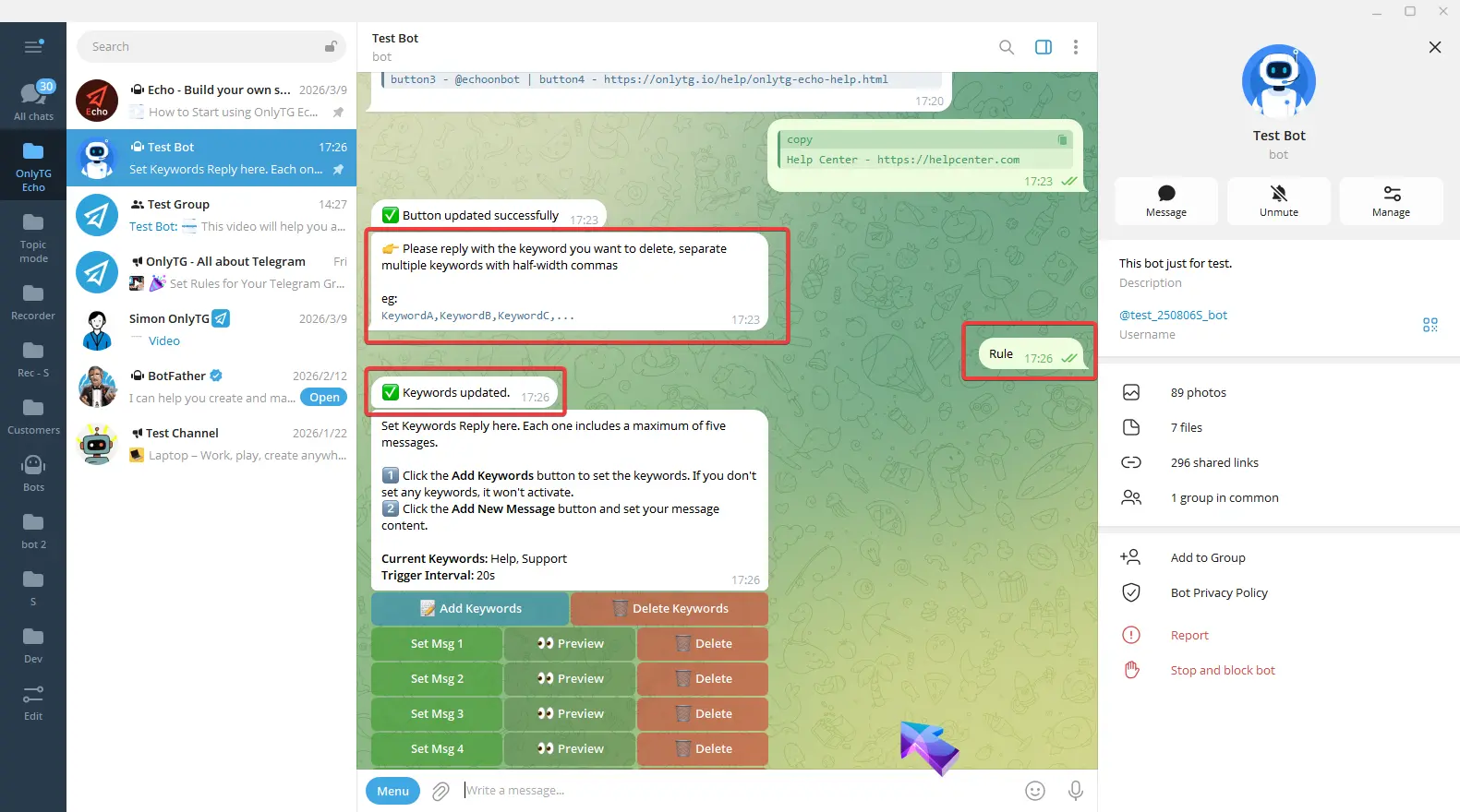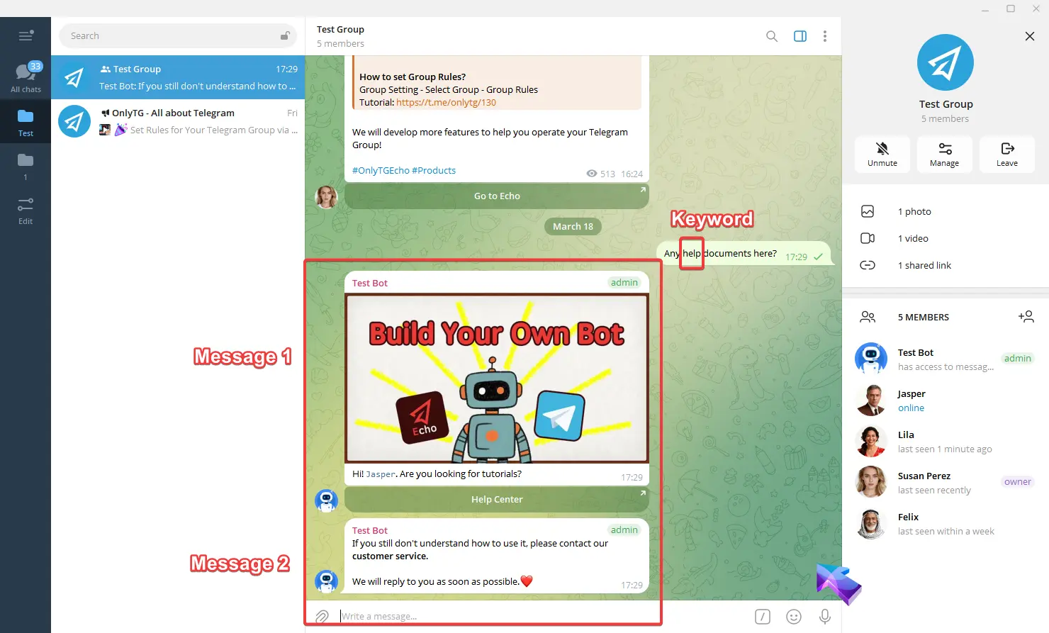 Now when the keyword is sent in the group, your preset messages will be sent in sequence via your bot.