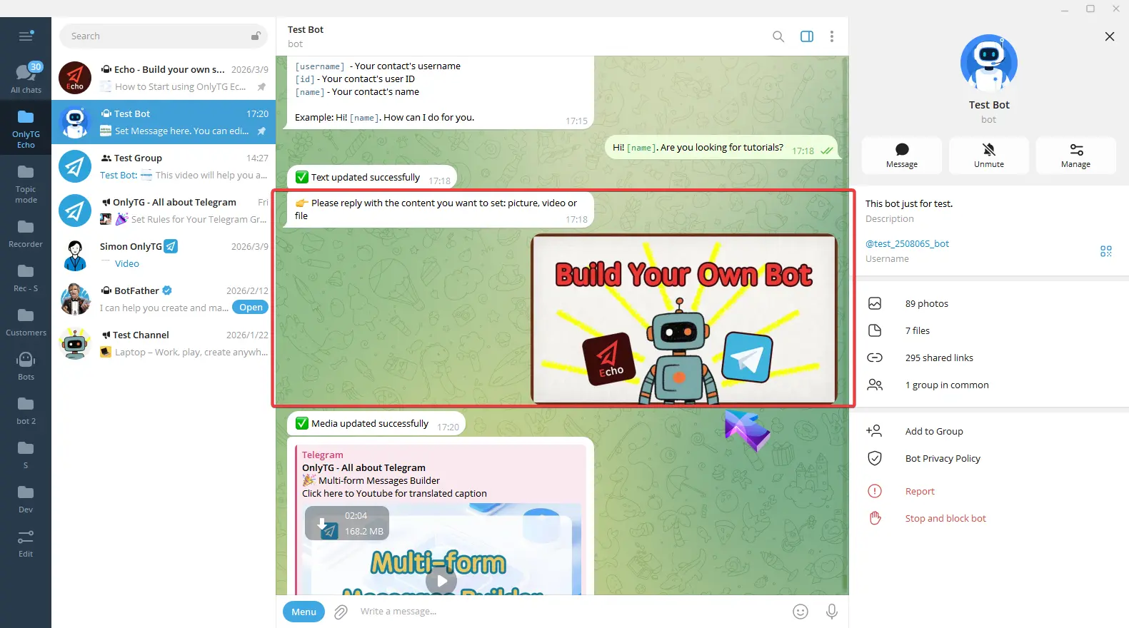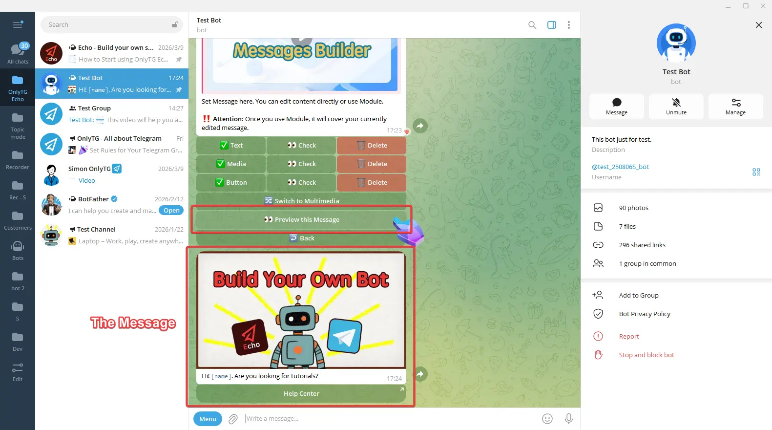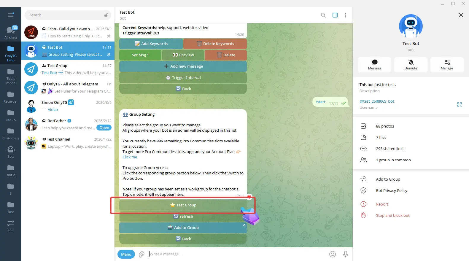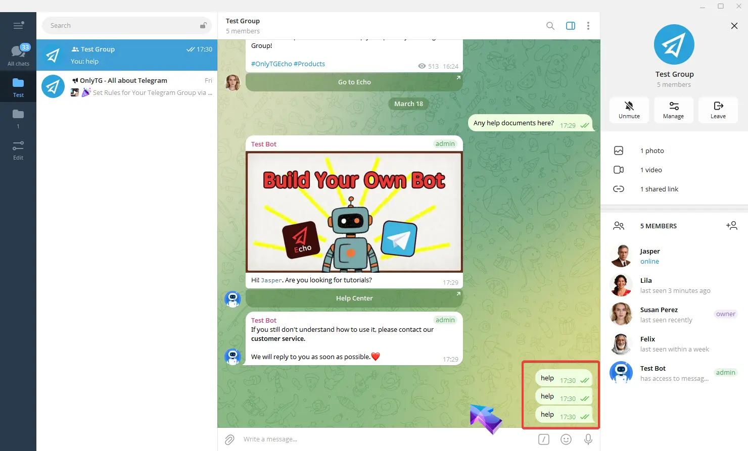 Now when the keyword is sent in the group, your preset messages will be sent in sequence via your bot.