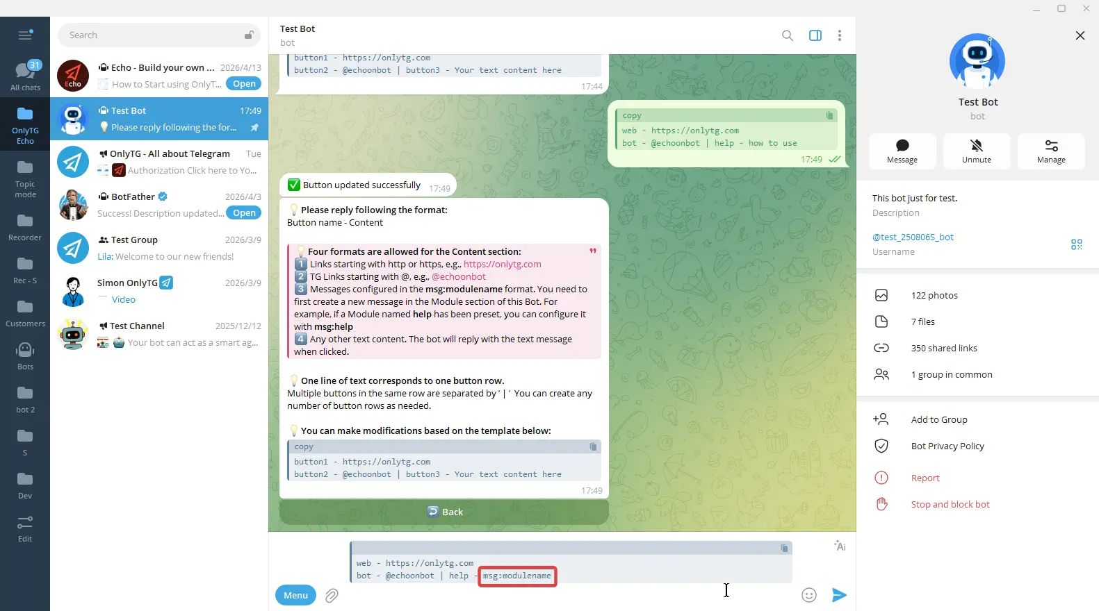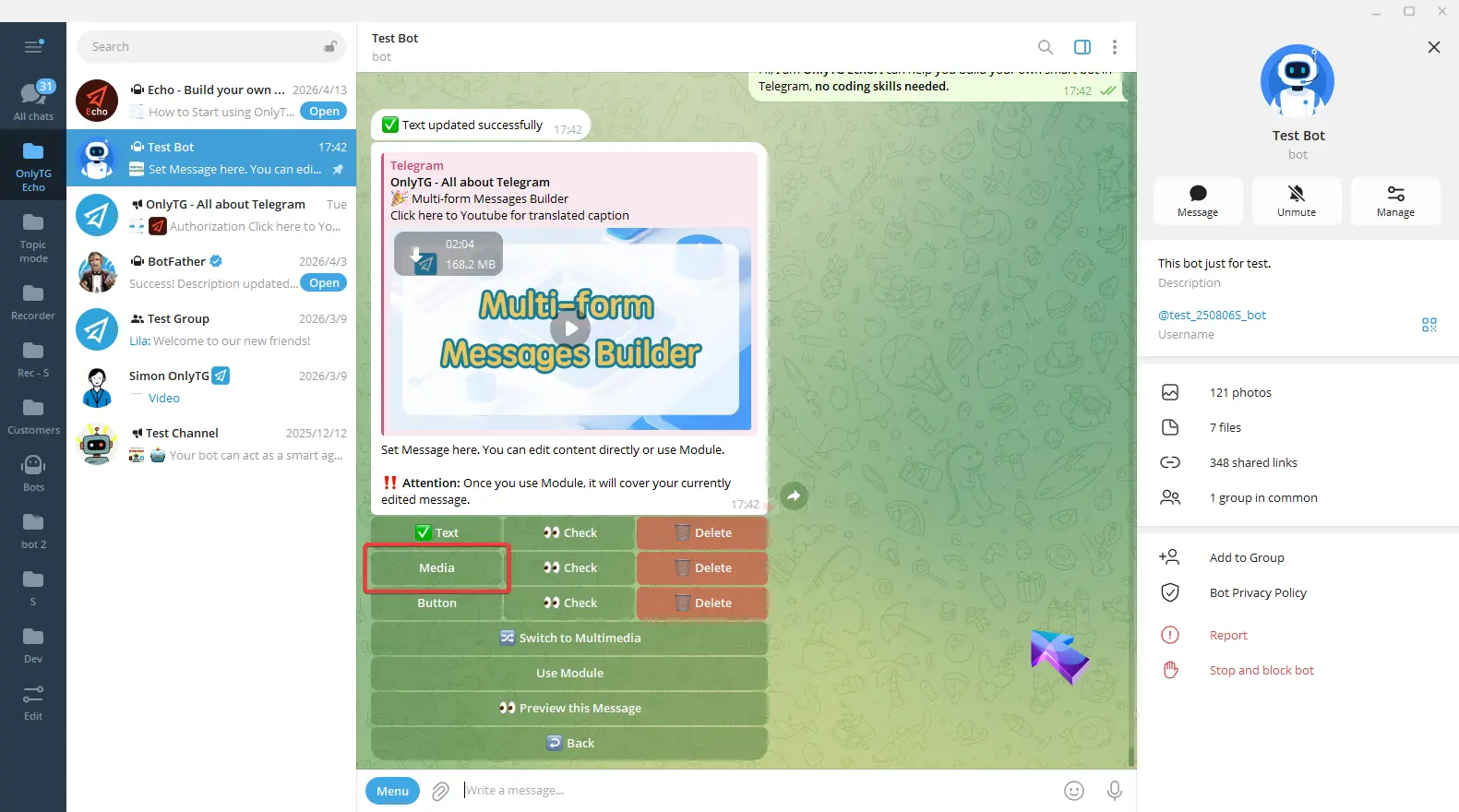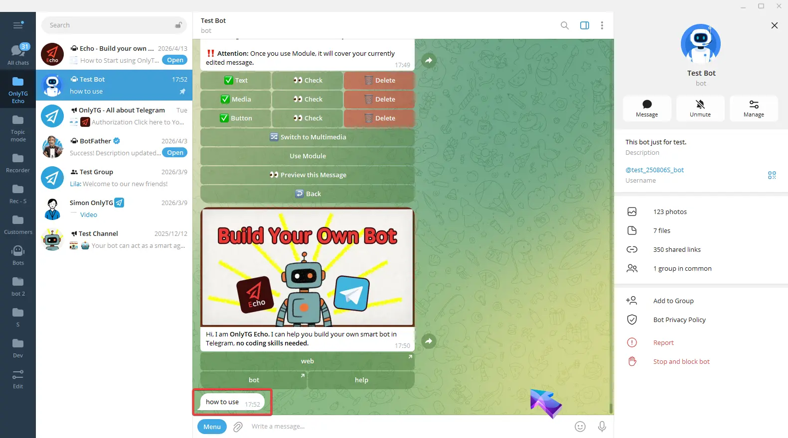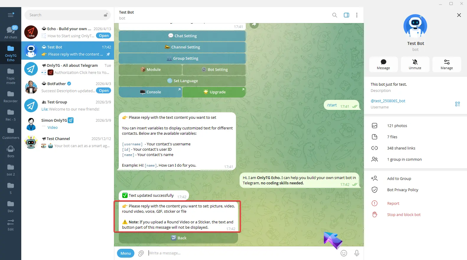 OnlyTG Echo provides the function to set message content with Multi-form Messages Builder. You can use the function when setting the message content for Start Message, Auto-reply, Quick reply, etc.