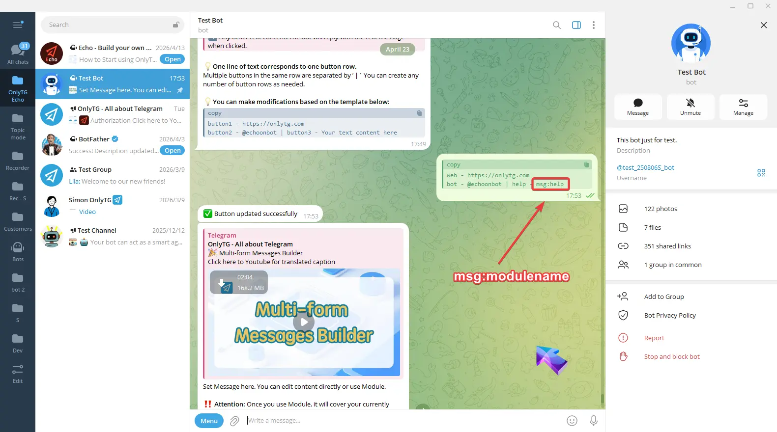 Here, the module name refers to the name of your pre-set module. For example, if you have created a module named help, simply enter msg:help.