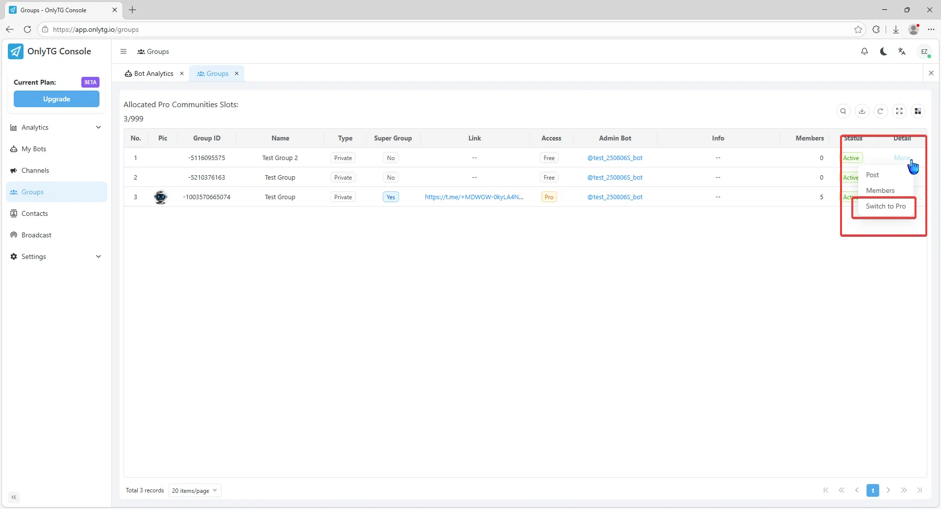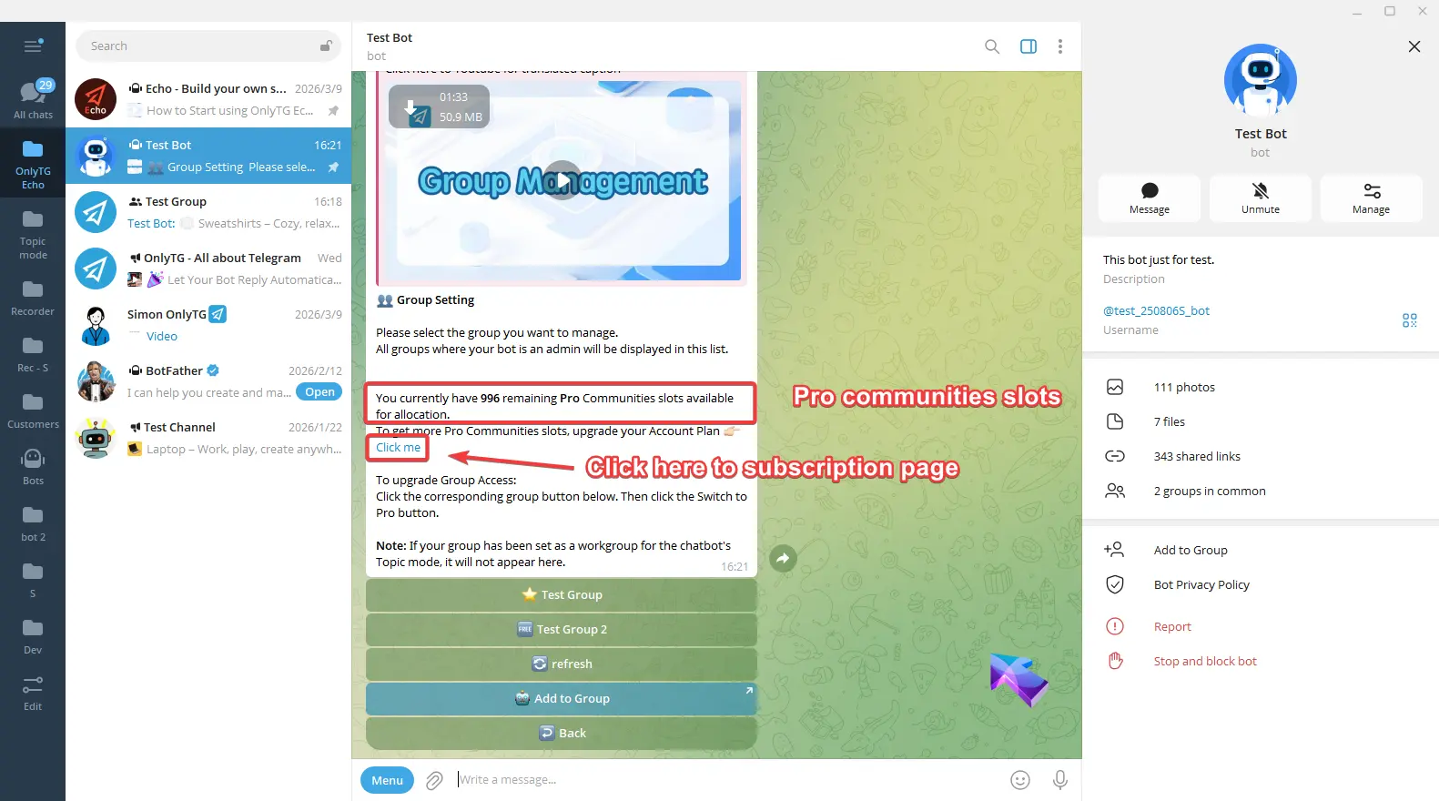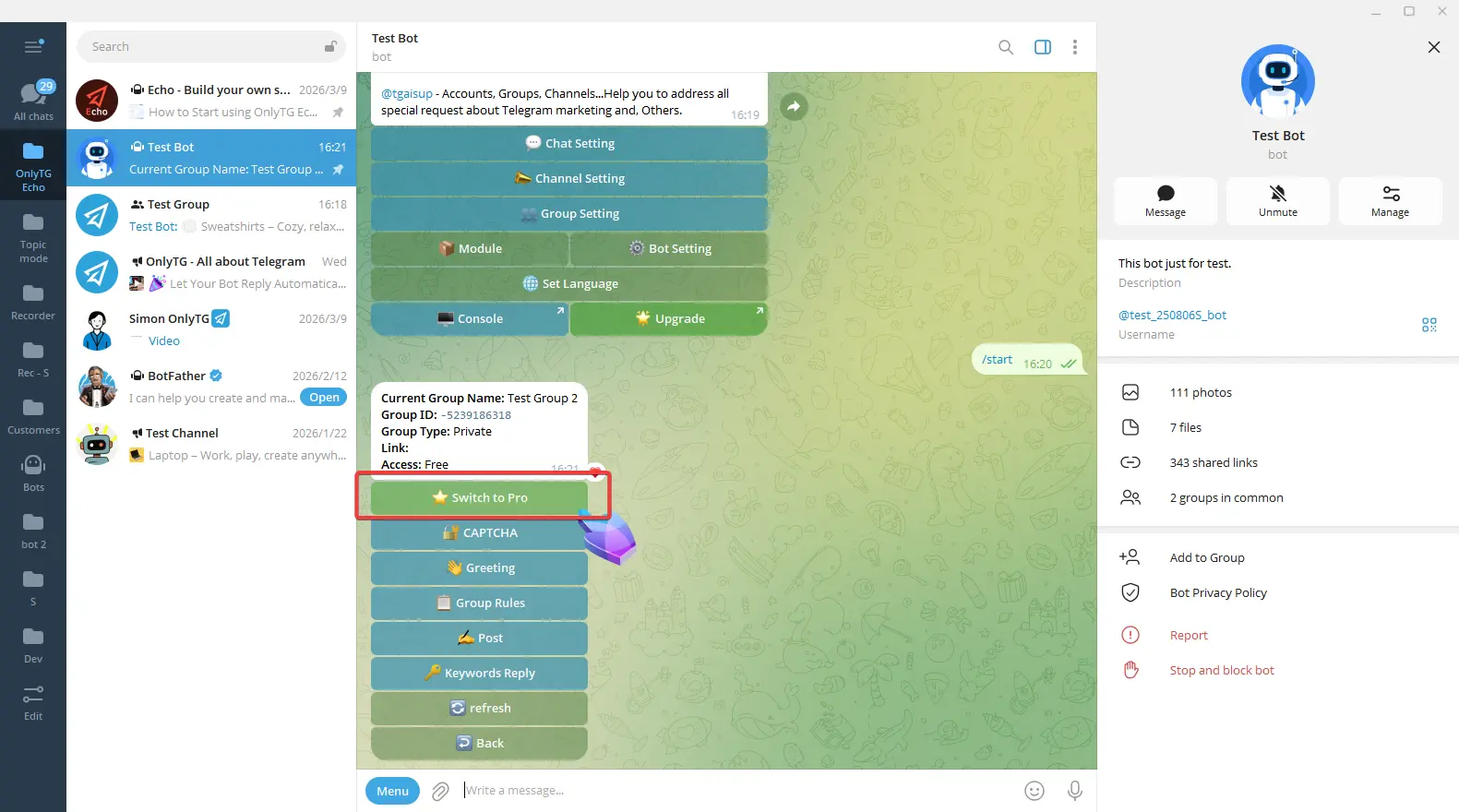 OnlyTG Echo provides the function to upgrade your Group to Pro Group. This will consume your Pro Communities slots and unlock more advanced features.