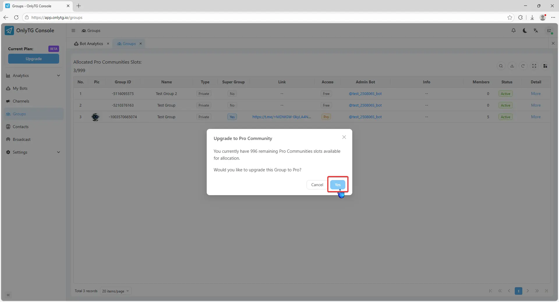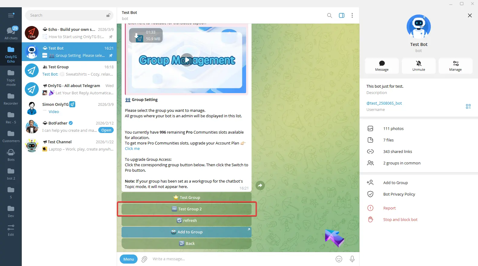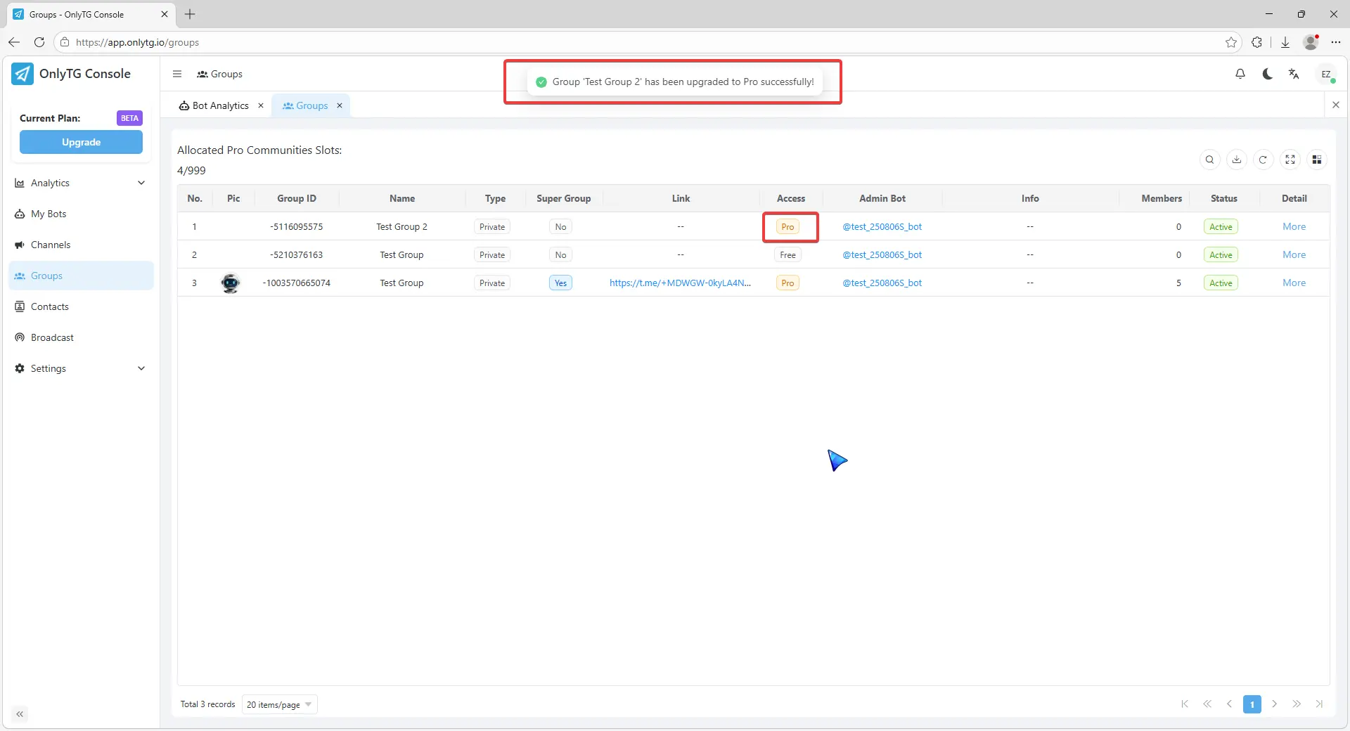 OnlyTG Echo provides the function to upgrade your Group to Pro Group. This will consume your Pro Communities slots and unlock more advanced features.