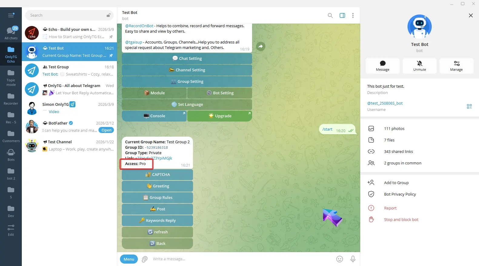 OnlyTG Echo provides the function to send the CAPTCHA test to new members joining the group. Firstly, you need to create a new bot…