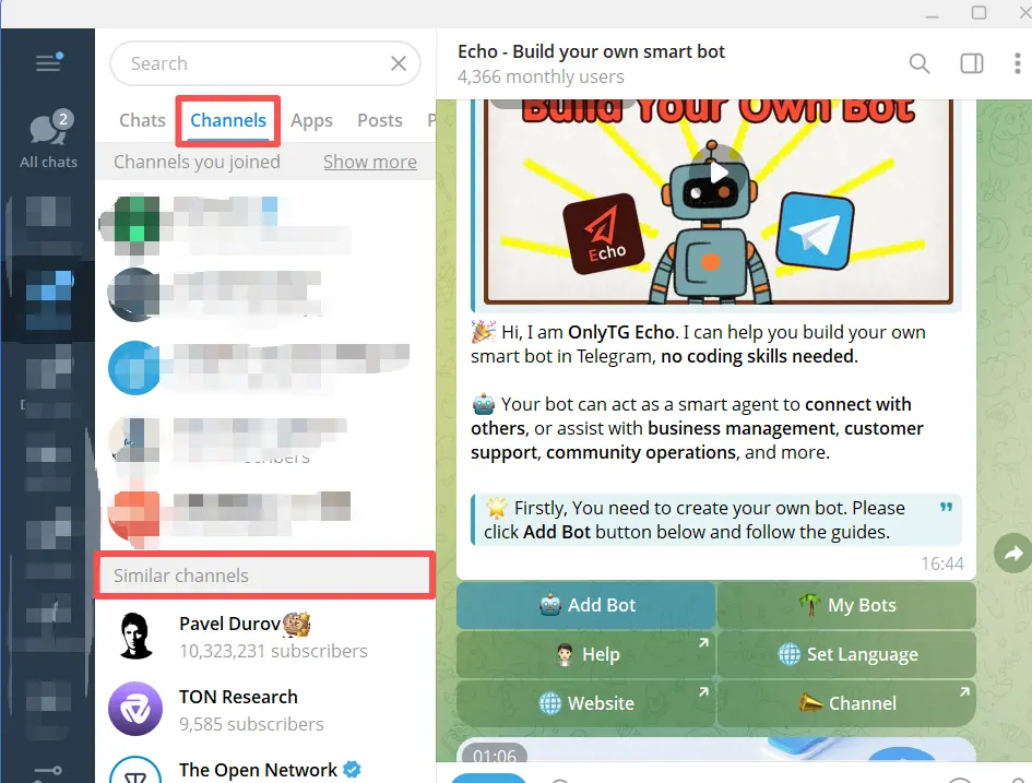 Open the Telegram app and select Channel from the options below the search bar. In the similar channels section below, Telegram will automatically show recommended similar channels based on the channels you have joined.