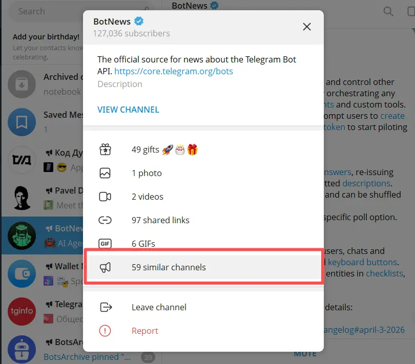 Open the profile page of a channel or group, find the Similar Channels option below, and tap it to see many recommended channels with similar content.